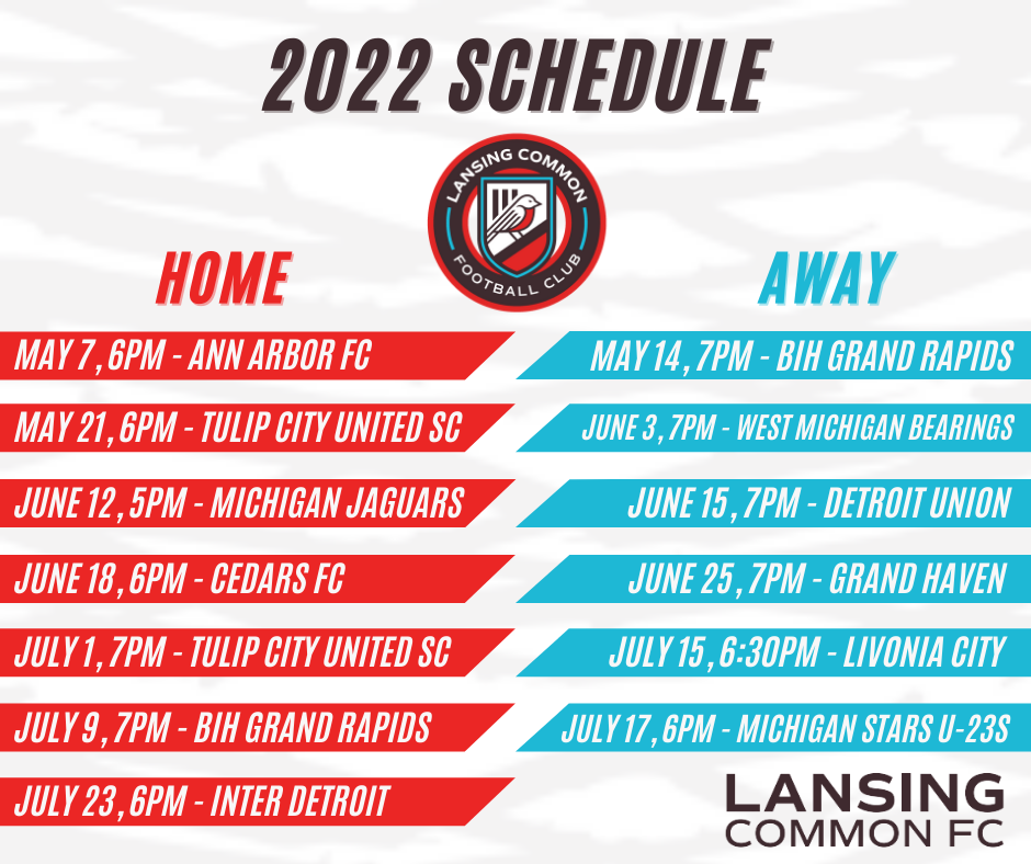 In addition to its 10 league matches, Lansing Common’s schedule includes the May 7 friendly against Ann Arbor FC, at least 2 matches in the Grand River Open Cup, and at least one additional home match to be announced in the coming weeks.