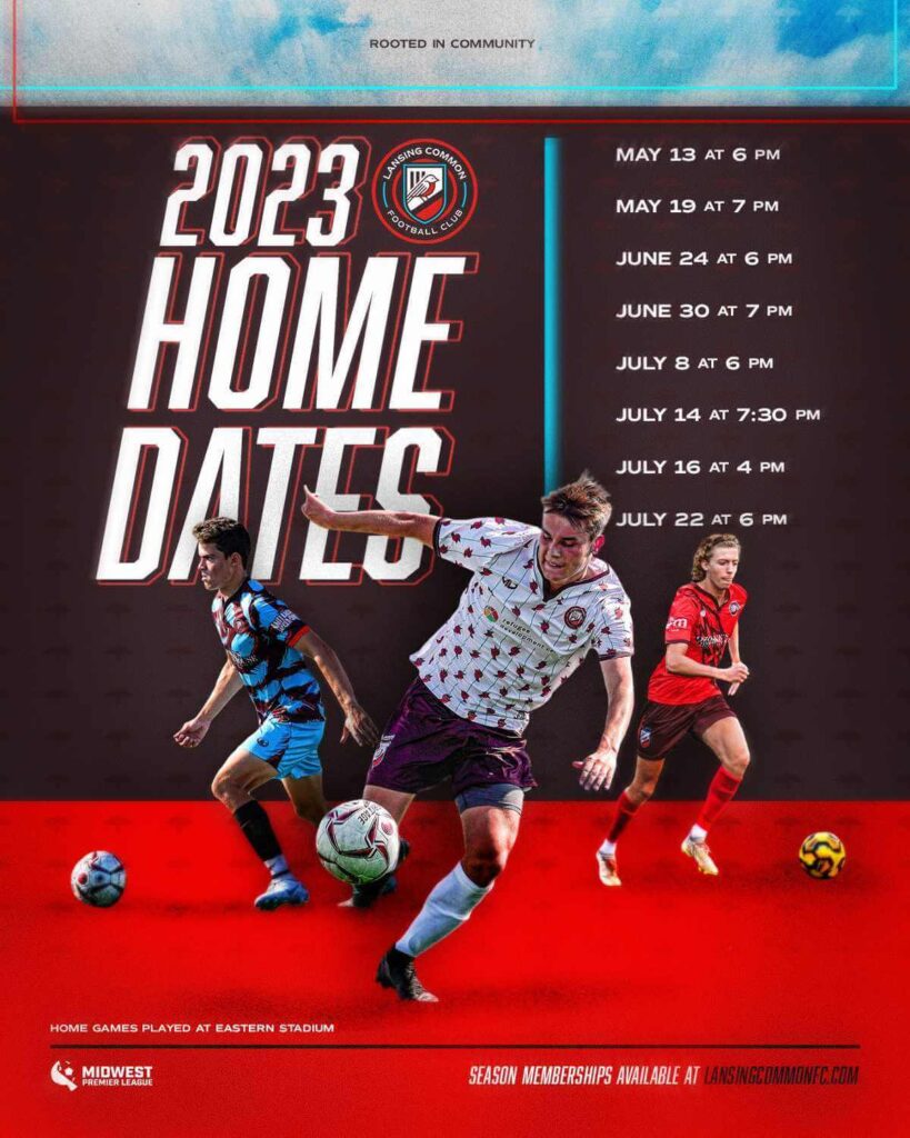 Lansing Common kicks off its 2023 season with the free Community Soccer Kickoff on Sunday, May 7 at 2 PM at Eastern Stadium, followed by its first home game on May 13 at 6 PM at Eastern Stadium against Troy United. Tickets are available through the Fanbase app or on the Lansing Common website.